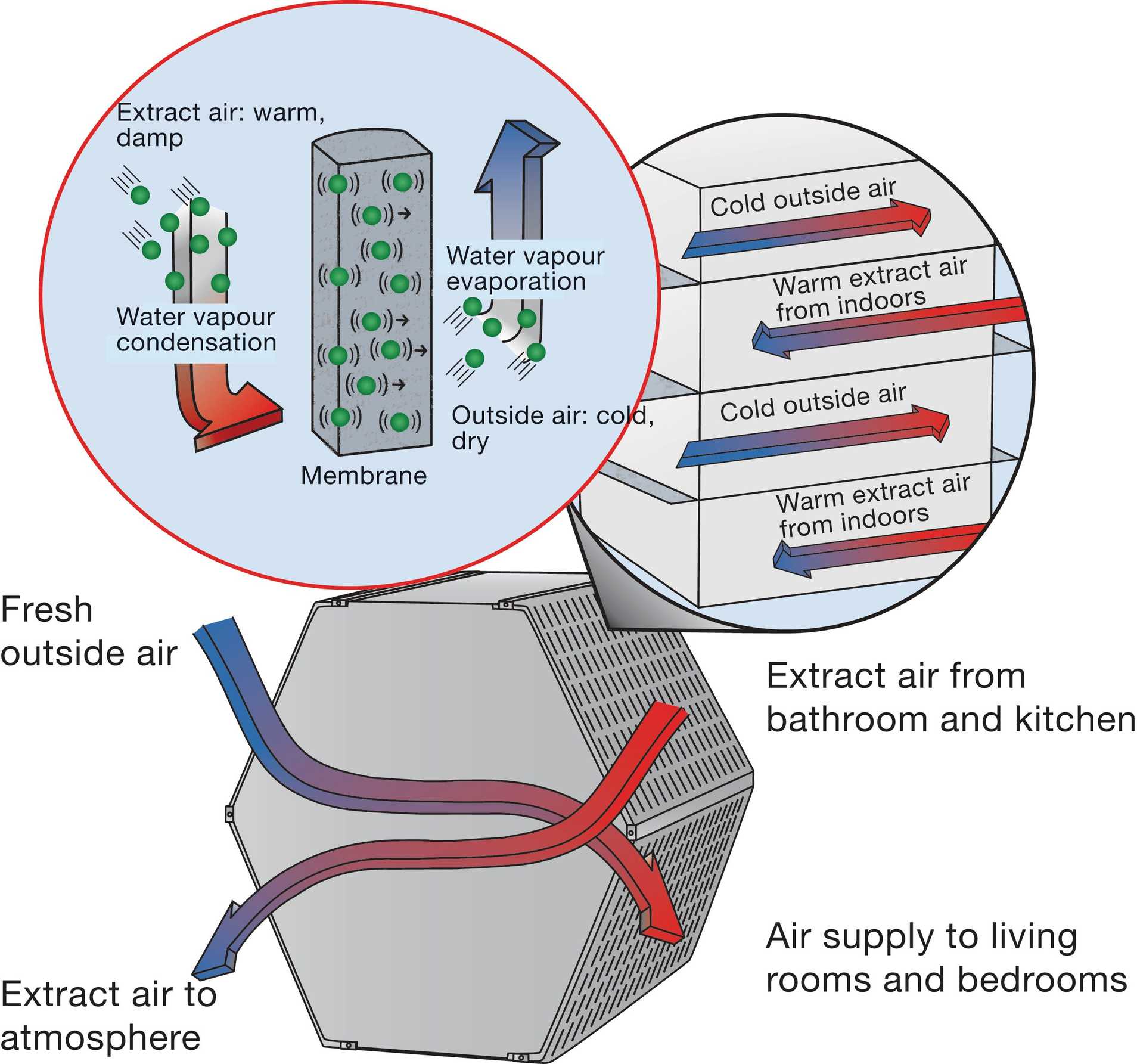 The Zehnder Enthalpy Exchanger recovers both the thermal and the latent energy from the stale air extracted from wet rooms around the home. This additional energy, which would otherwise have been lost, is transferred into the incoming fresh air stream before being supplied to habitable rooms.
