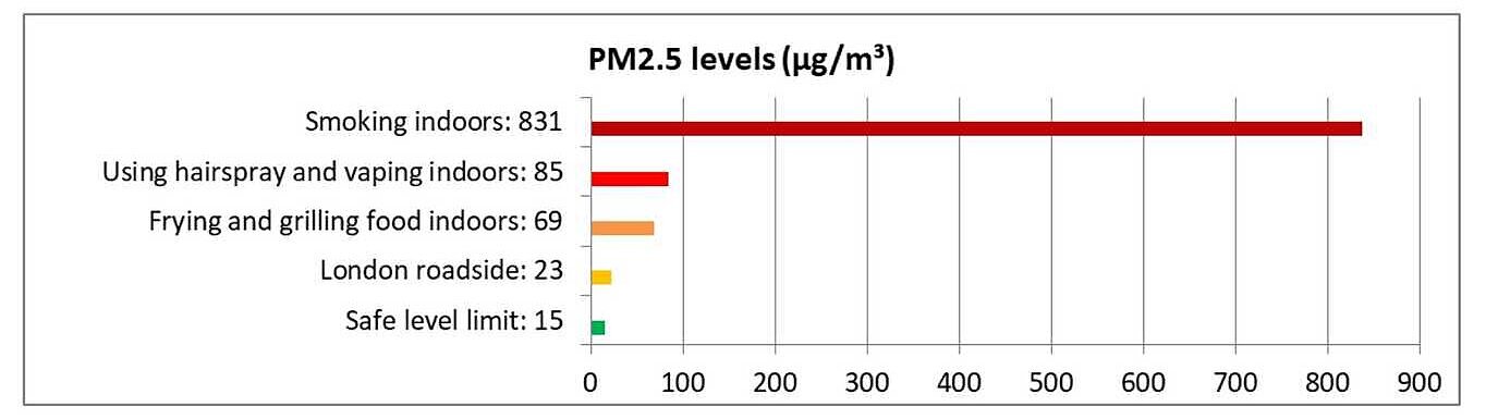 The study showed that cooking meals such as omelettes, stir-fries and grilled foods raised pollution levels in the kitchen to over three times that of a typical London road. Using hairspray when getting ready in the morning for example also caused a huge spike in harmful dust particles.